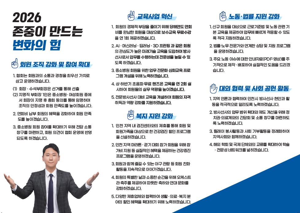 공지 [선관위]회장 선거 기호2번(황덕기, 이왕희) 선거포스터 및 동영상 페이지 정보 작성자IRTA 댓글0 조회122 작성일26.01.19 17:19 본문 기호 2번 황덕기, 이왕희 선거 동영상 이전글[선관위]감사 선거 기호1번(김병식) 정견서 26.01.19 다음글[선관위]회장 선거 기호1번(주국환, 문현상) 선거포스터 및 동영상 26.01.19 Comment 0 댓글목록 등록된 댓글이 없습니다.